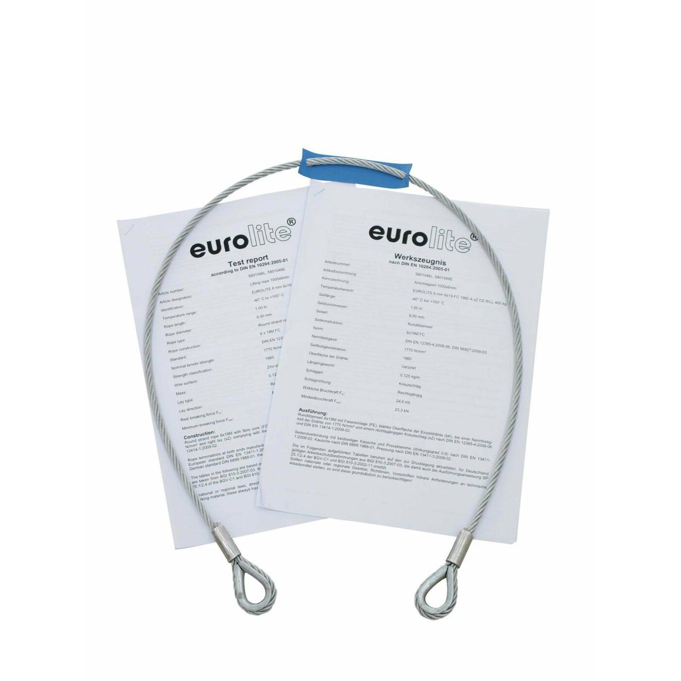 The EUROLITE safety bonds comply with the current regulation of the German professional insurance association as summed up in BGI 810-3:2007-03 Loads above persons. The safety bonds are constructed in accordance with the European standards DIN EN 12385-4:2008-06 and DIN 56927:2009-03.