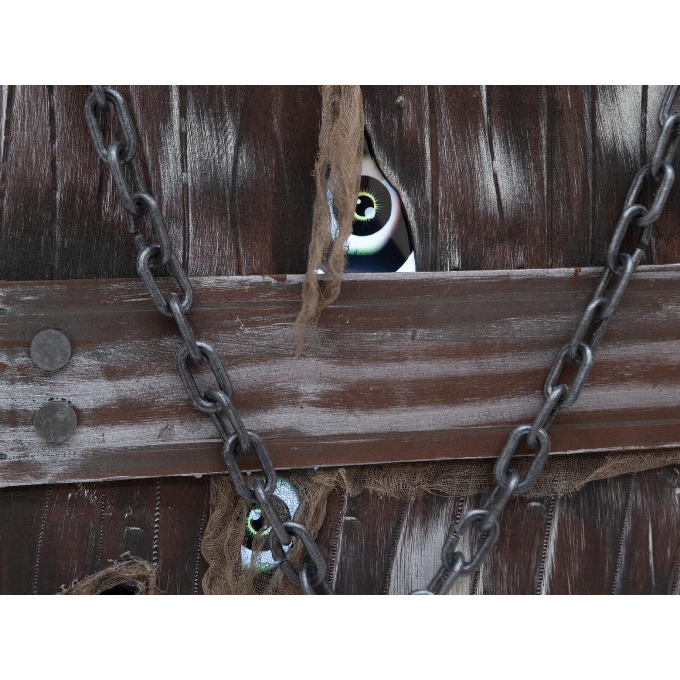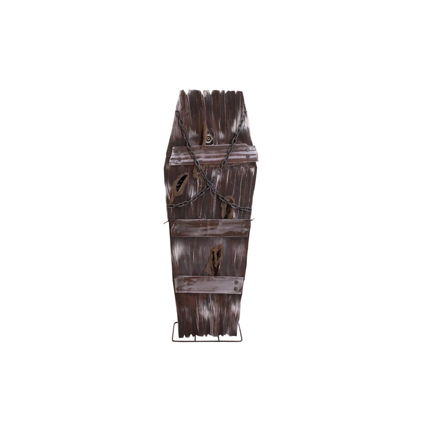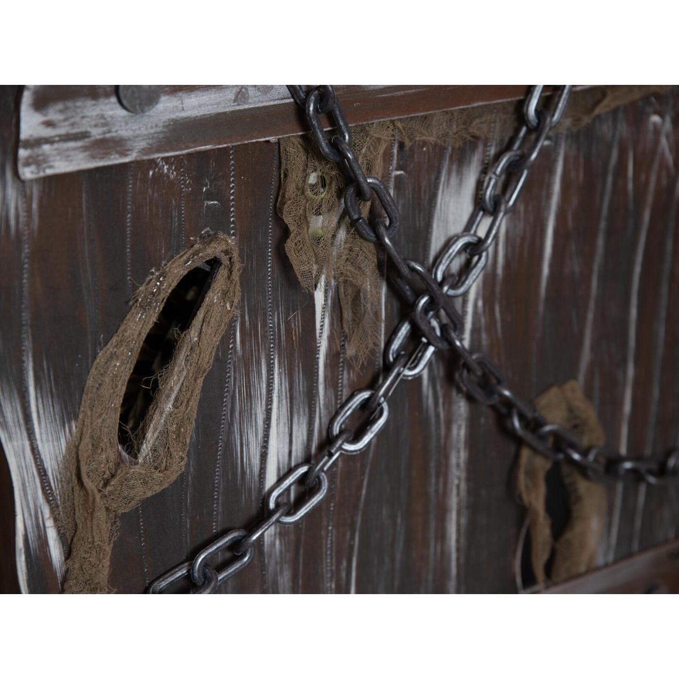 A macabre addition to any Halloween scene. Whether as an eye-catcher in the entrance area, as an eerie prop in a haunted house or as a gruesome shocker at a Halloween party: the “coffin of horror” will send chills down your spine and leave no one unimpressed.Creaking wood and eerie shadows – this coffin hides a dark secret. Once perhaps the final resting place of a criminal, it is now anything but silent. Its rotten boards are riddled with cracks and crevices, as if something had tried to break free from inside with unbridled force. However, two massive chains in the upper area seem to hold back the horror – but is the first impression deceptive? When the animation is activated, the coffin comes to life. A plaintive moan and cries emanate from its interior, while a bony hand reaches through one of the holes in the lid – groping, searching, ready to grab any unwary visitor. At the same time, two eyes peer out through further openings, dimly lit to ominous life.The animation of the Halloween decoration is activated by an integrated microphone or wired control.