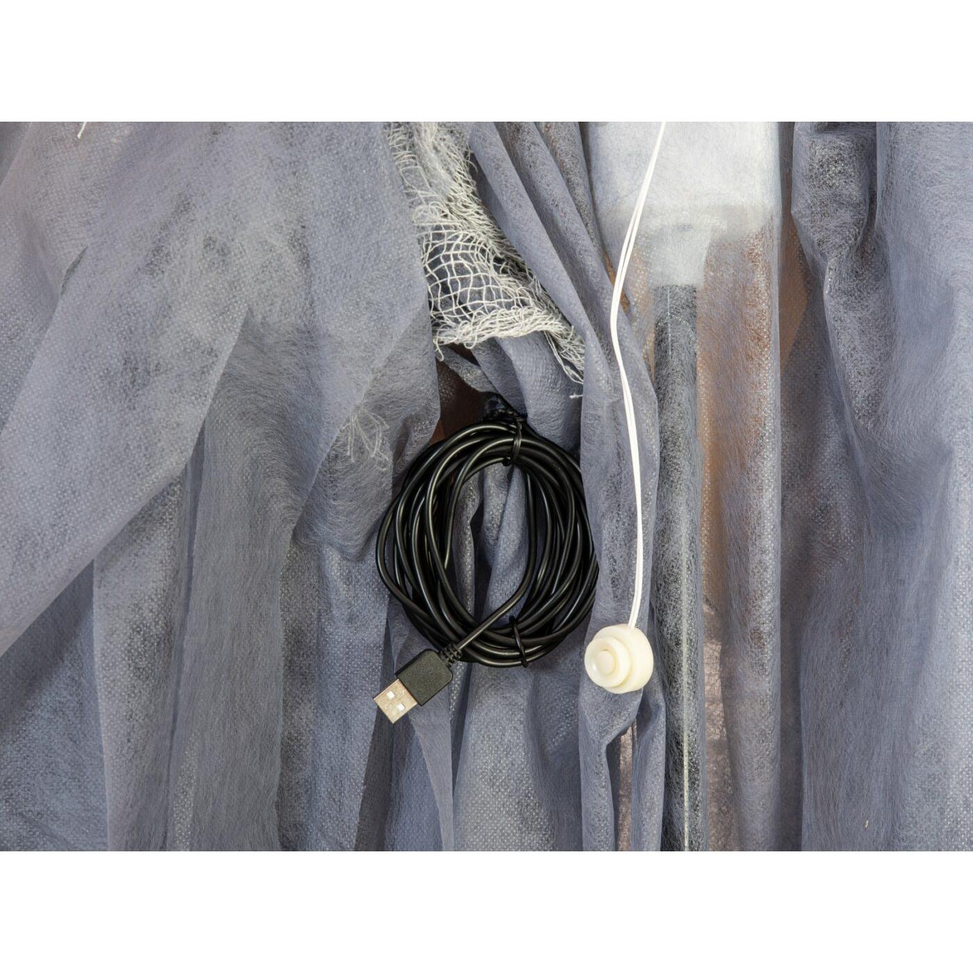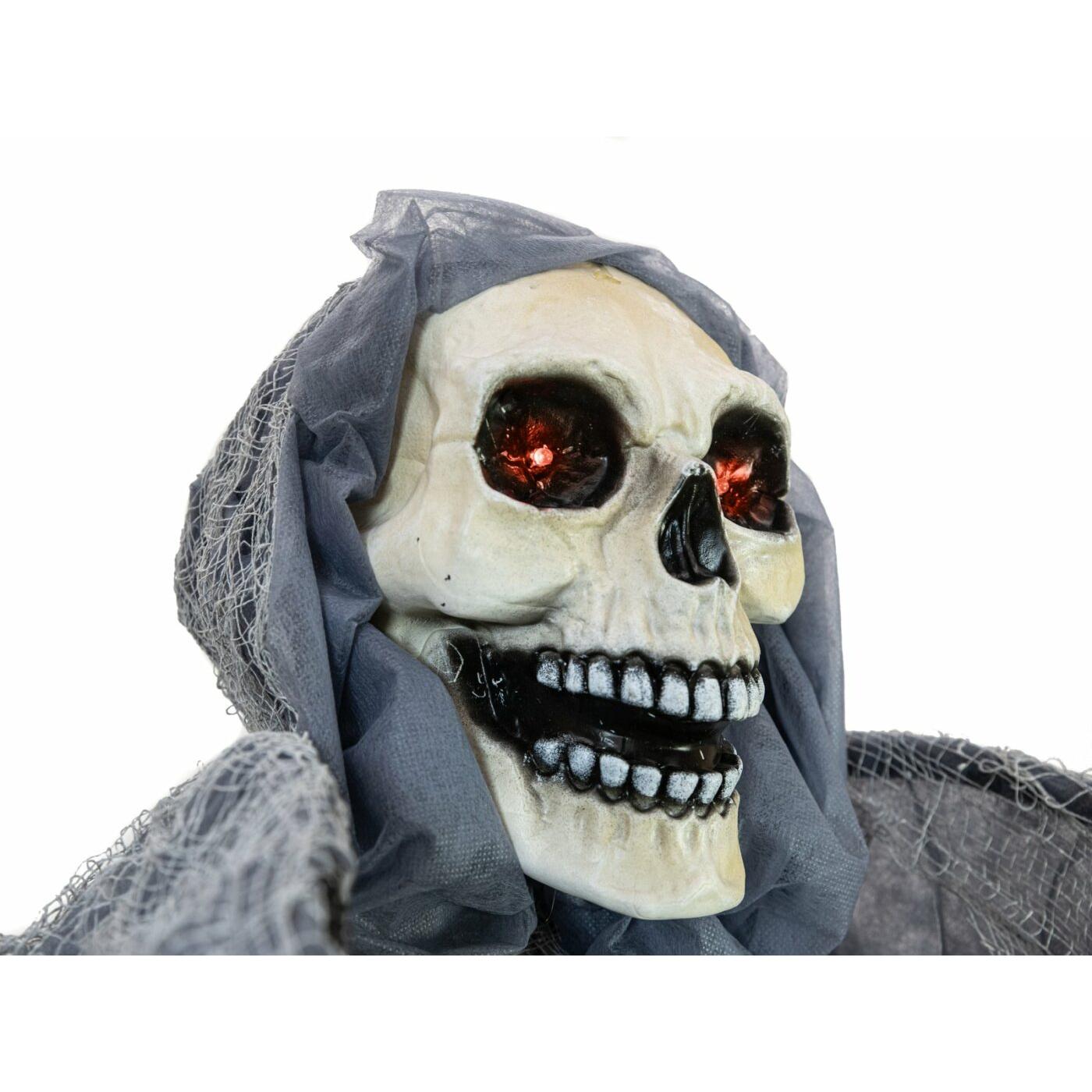 When ghosts and ghouls appear on Halloween night and the undead rise from their graves, the angels of death are not far away. Numerous myths and legends tell of angels of death whose task is to bring the souls of the deceased to the afterlife. That’s why their appearance usually sends an ice-cold shiver down people’s spines. Which soul will be picked up next?In this animated still figure from Europalms, the angel of death is dressed in a thin, semi-transparent hooded robe and a coverlet hanging in tatters. His bony chest protrudes from a large hole in the robe and is mysteriously highlighted by a green LED. Red flashing LEDs in the eye sockets complete the eerie light effect. Due to a built-in mechanism, the arms and wings of the Halloween decoration figure move and seem to want to grab visitors, while the head performs circular movements. Meanwhile, a loud groaning and moaning can be heard, accompanied by the rattling of chains.By integrated microphone, the switch pad “Step here” or wired, manual control, the animation of the decorative figure can be activated.The power supply of the Halloween figure can be done via battery operation, USB-A cable for 5 V operation via power bank or power supply.