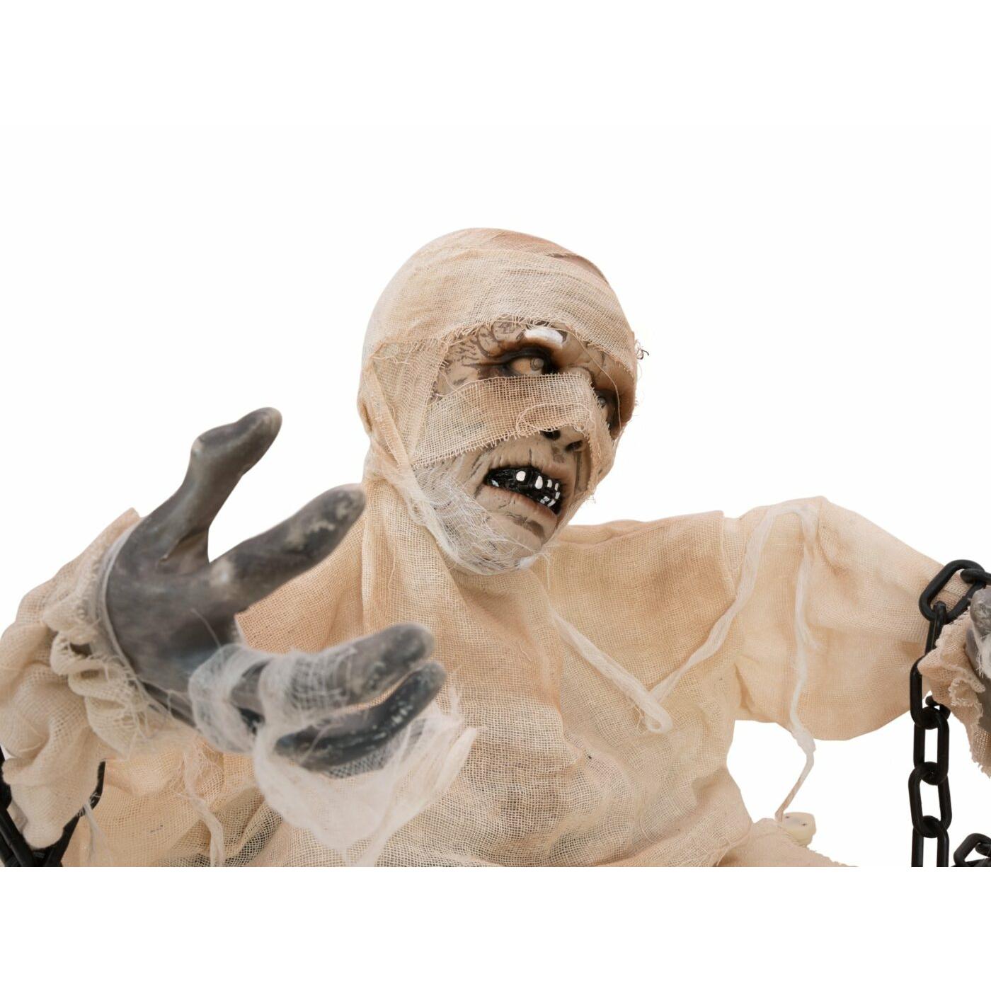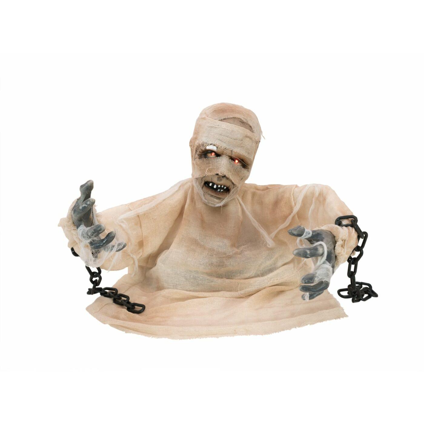 The Groundbreaker Mummy from Europalms provides the right eerie atmosphere at your Halloween festivities and should not be missing at any party!Even though the mummy wrapped in gauze has not yet fully risen from its dark grave, it will give your party guests a good shiver down their spines.While its eyes are flashing red, its head is jerkily moving back and forth. At the same time, the figure tries to “grab” with both arms anyone who comes too close to it. There is a groaning and moaning sound with chains rattling.Around each wrist, an approx. 35 cm long chain made of plastic is attached. Some chain links are unraveled on one side, so that additional accessories can be included in the decoration.The animation of the bust is activated by integrated microphone or wired manual control. Before operating, please ensure a sufficiently large and secured set-down area, as the figure moves by itself.