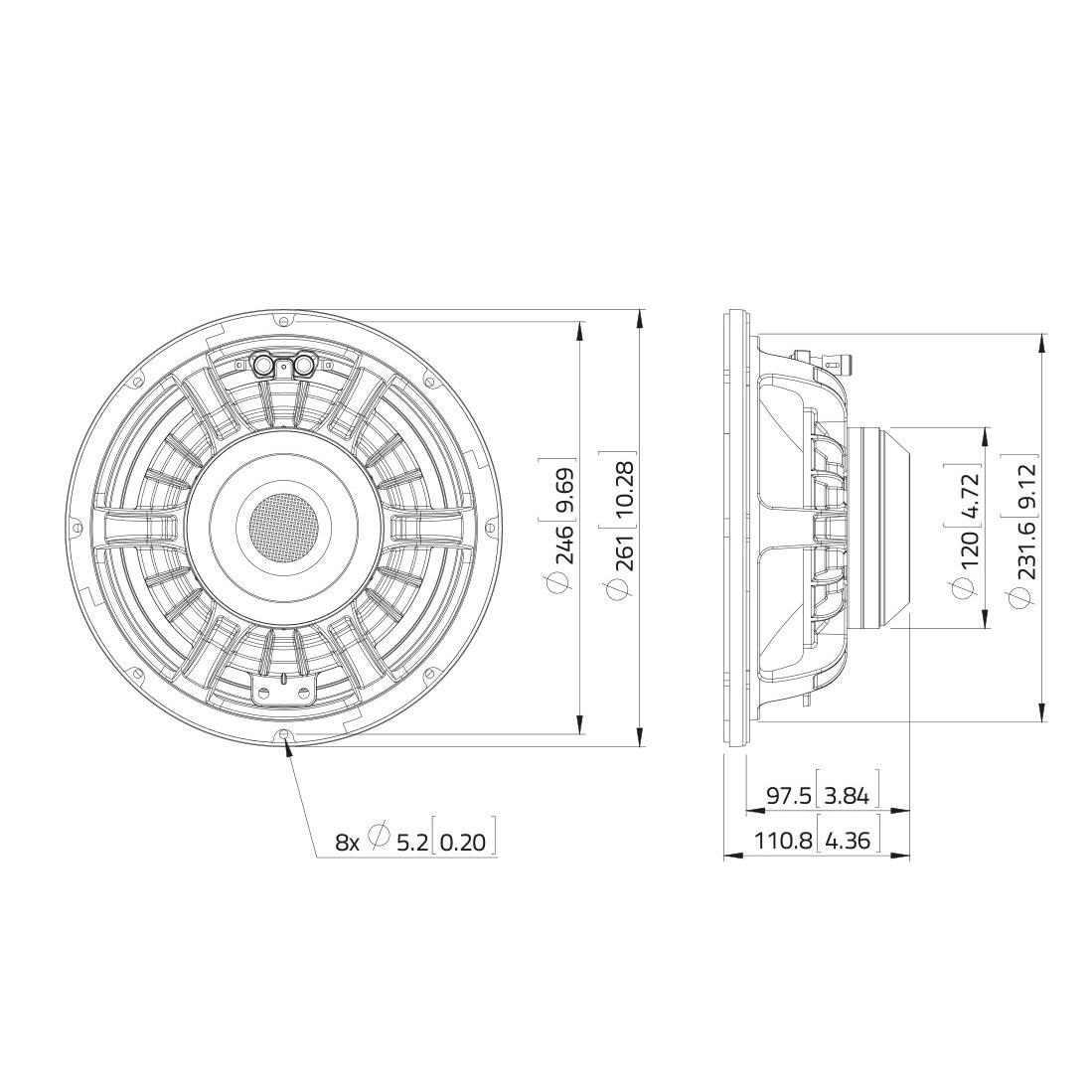 | Diameter: | (10″) ca. 25 cm Basket diameter; (3″) ca. 8 cm Moving coil |