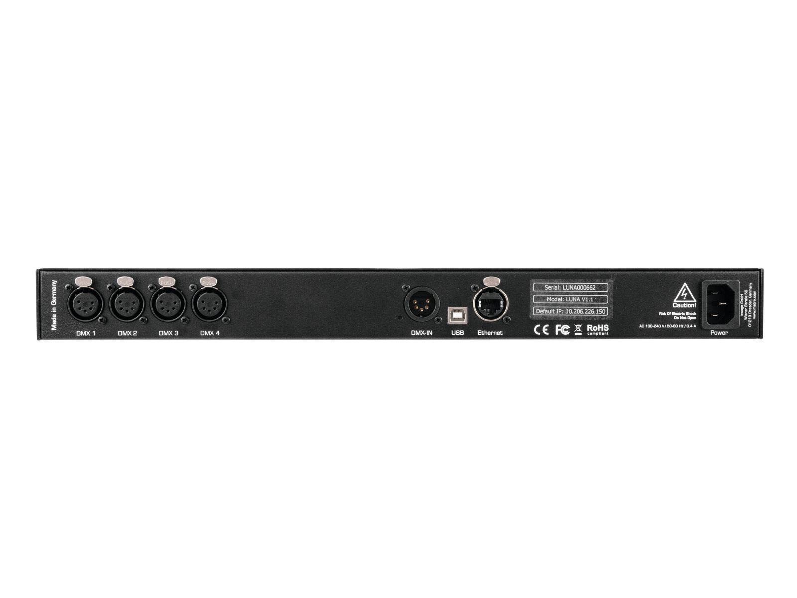 - Connectivity: 4x DMX-OUT, 1x DMX-IN, 1x RJ45 Ethernet port, 1x USB port, 1x Power socket