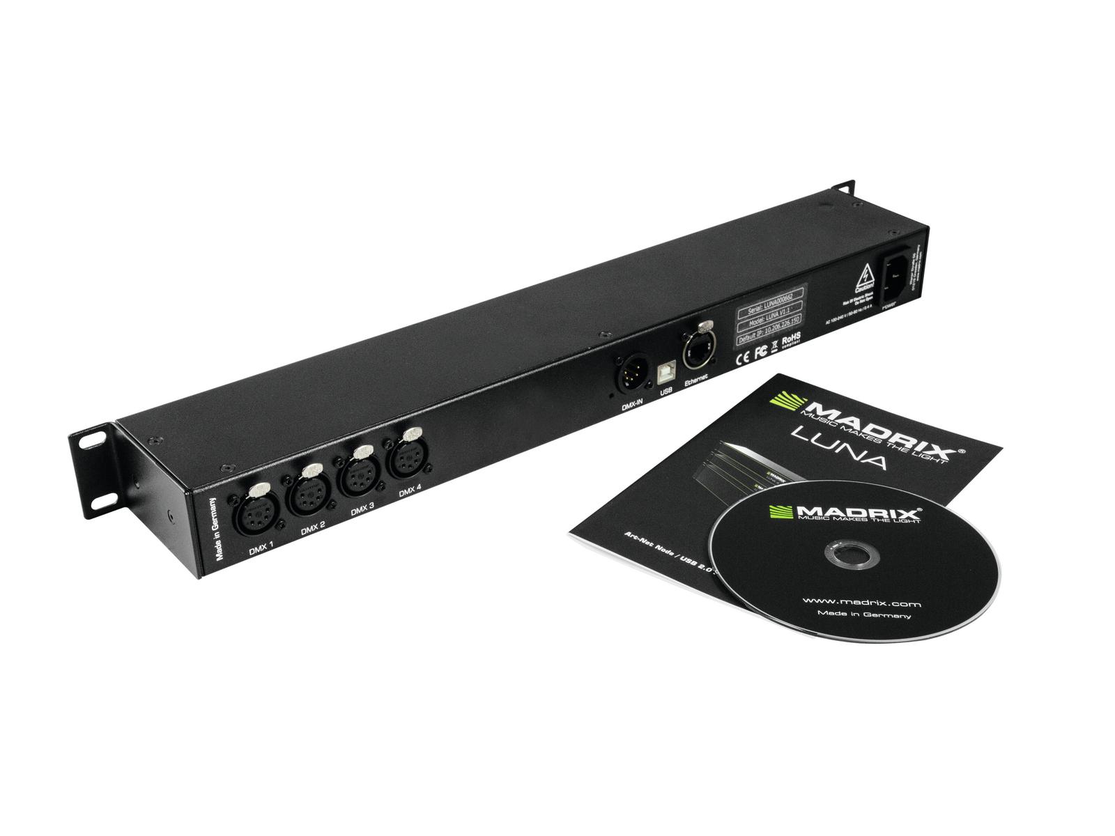 - Package Contents: 1x MADRIX LUNA 4, 1x Power cord (IEC C13), 1x USB 2.0 cable (certified), 2x Mounting brackets (already mounted to the device), 1x Quick start guide, 1x CD-ROM incl. MADRIX and USB drivers (software license not included)
