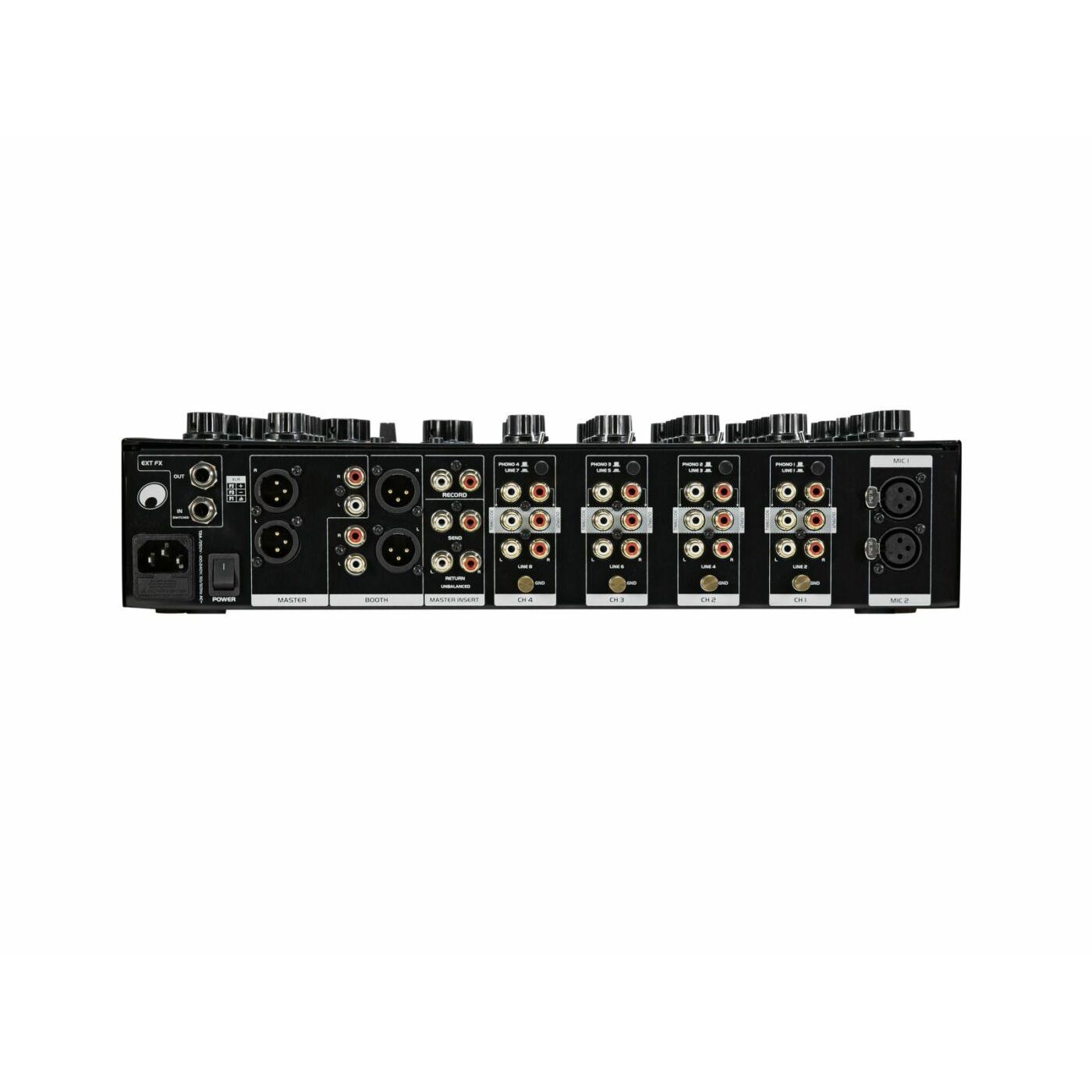 - Outputs: master and booth (XLR/RCA L/R), record (RCA L/R), master insert send/return (RCA L/R), FX in/out (stereo jack)