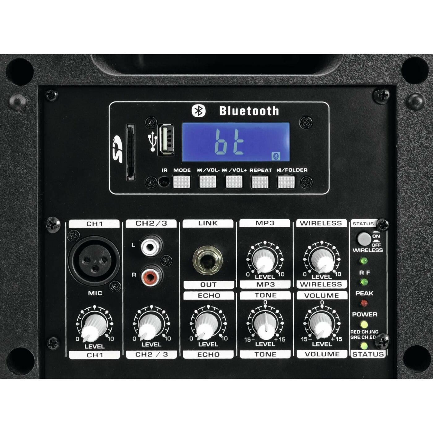 Mobiele 6,5″ PA met UHF ontvanger, audio (mp3) player, Bluetooth en 40 W RMS vermogen.