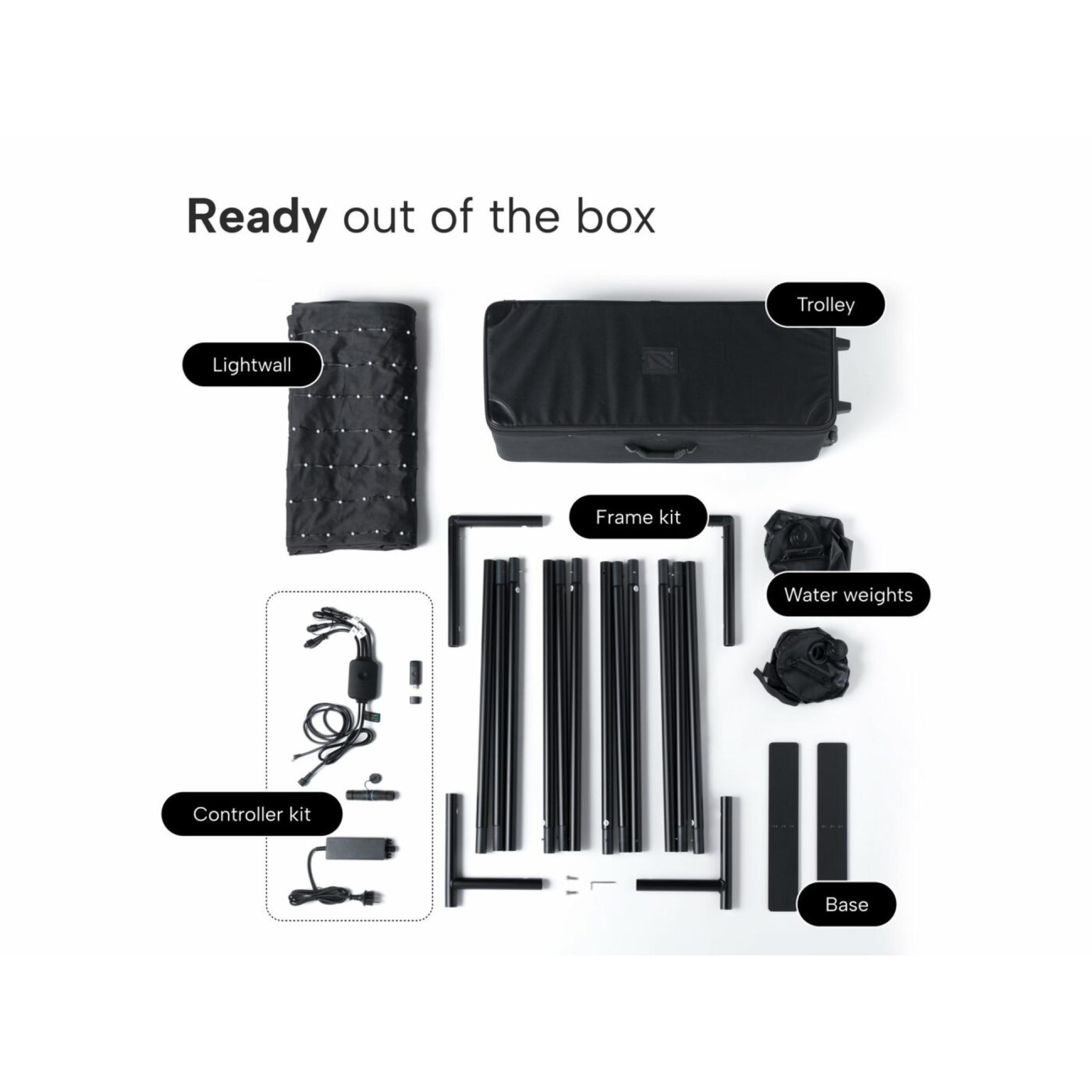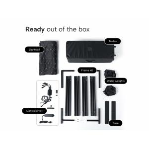 - 1 x bag, 1 x curtain, 1 x external mains adapter, 1 x controller, 1 x dongle, 1 x frame, 2 x foot, 2 x balance weights, 2 x screw, 1 x user manual